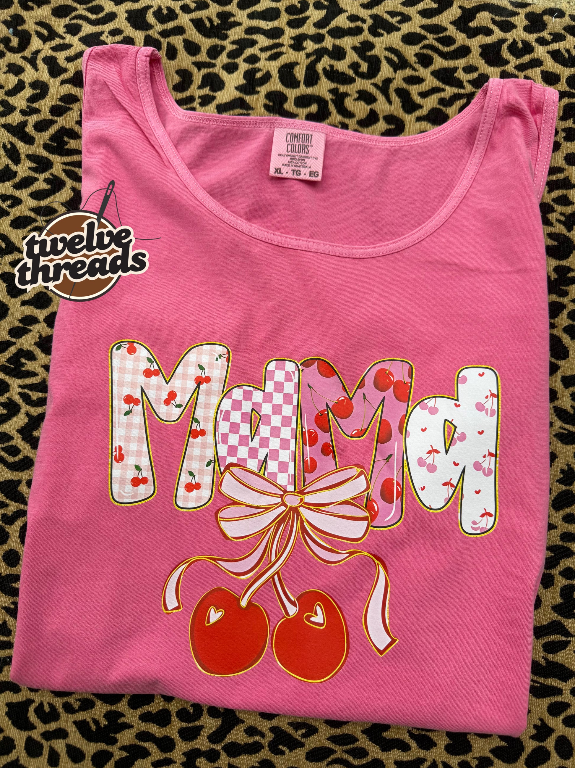 Mama on comfort colors, Gildan, tank top summer, mama cherries, cherry preppy mama dtf design, unisex fit, floral striped mama, coquette bow